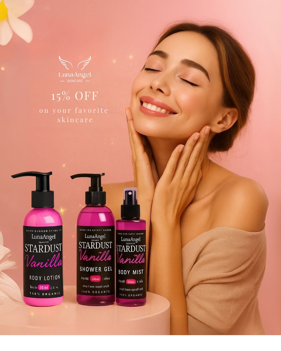 Indulge in luxury with the LunaAngel Stardust Vanilla Complete Glow Gift Set – the perfect bundle for radiant skin, soft hands, and a naturally glowing look.This 7-piece set features our best-sellers in the sweet, comforting scent of vanilla, made with 100% natural and organic ingredients. What’s Inside: Stardust Vanilla Body Lotion (250ml) – Deep hydration with a silky finish. Stardust Vanilla Shower Gel (250ml) – Gentle cleansing and long-lasting fragrance. Intensive Tanning Oil (220ml) – Achieve a sun-kissed glow with organic oils. Stardust Vanilla Hand Cream (100g) – Rich nourishment for soft hands. Stardust Vanilla Eyebrow Styling Wax (20g) – Shapes and tames brows. Stardust Vanilla Lip Balm (20g) – Moisturizes and protects lips. Stardust Vanilla Lip & Cheek Tint (15ml) – Adds a natural rosy glow.
